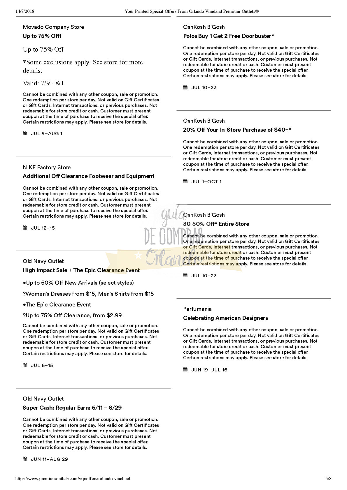 A continuación les dejamos los cupones para las distintas tiendas de Orlando International Premium Outlets ® y un link para conseguir además una cuponera llena de descuentos distintos a los que acá les damos.