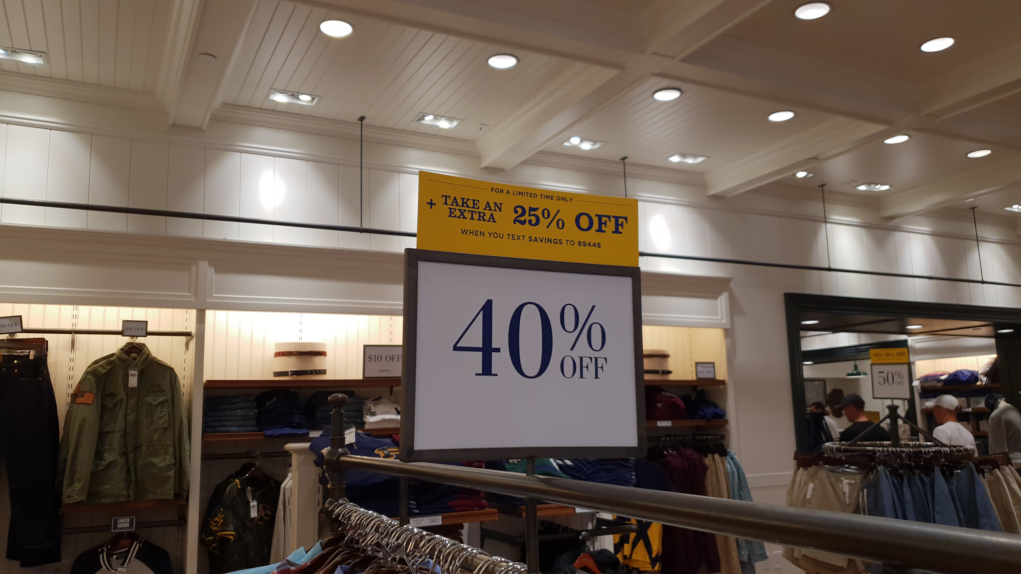 Esta oferta estaba vigente en el Orlando International Premium Outlets ®. Teníamos un cupón de descuento del 20% adicional. Lo más fácil es pensar que a una de estas camisetas de Polo Ralph Lauren ® que se vende a $ 16,99 debemos restarle el 40% del cartel + el 20% de nuestro cupón. ¡Error! Aquí las cuentas: