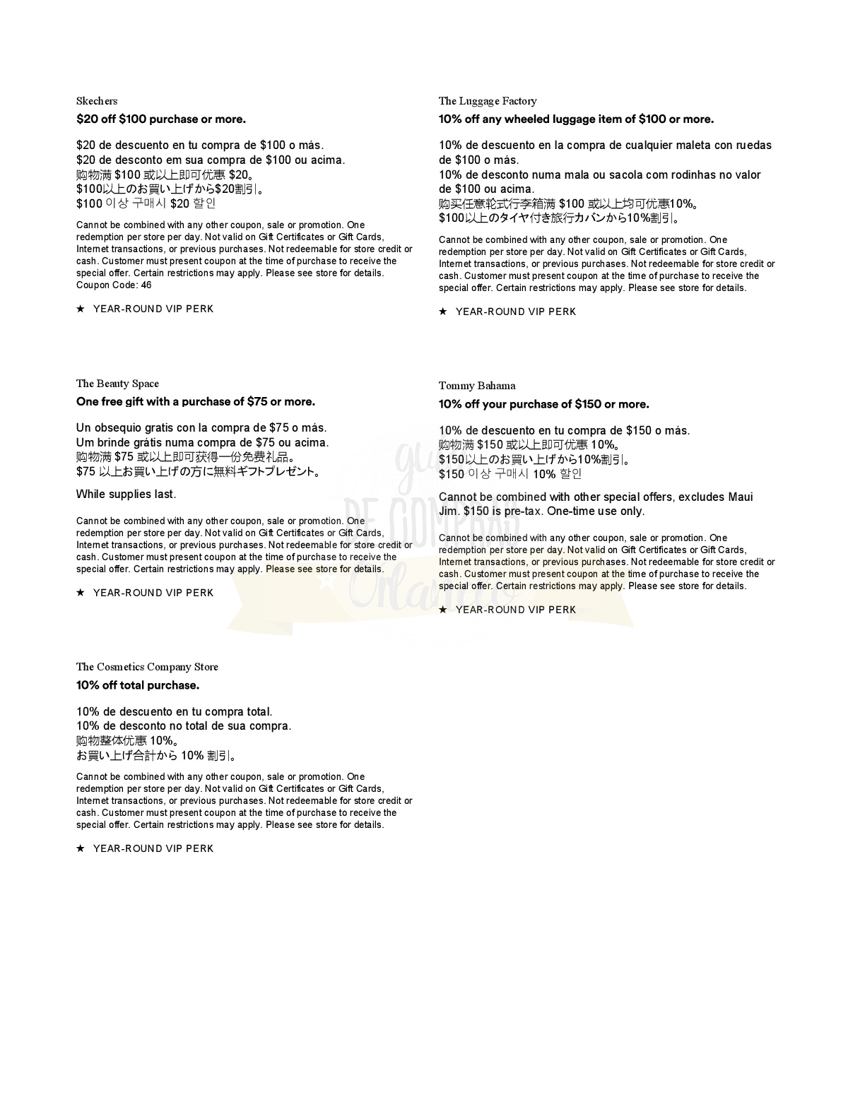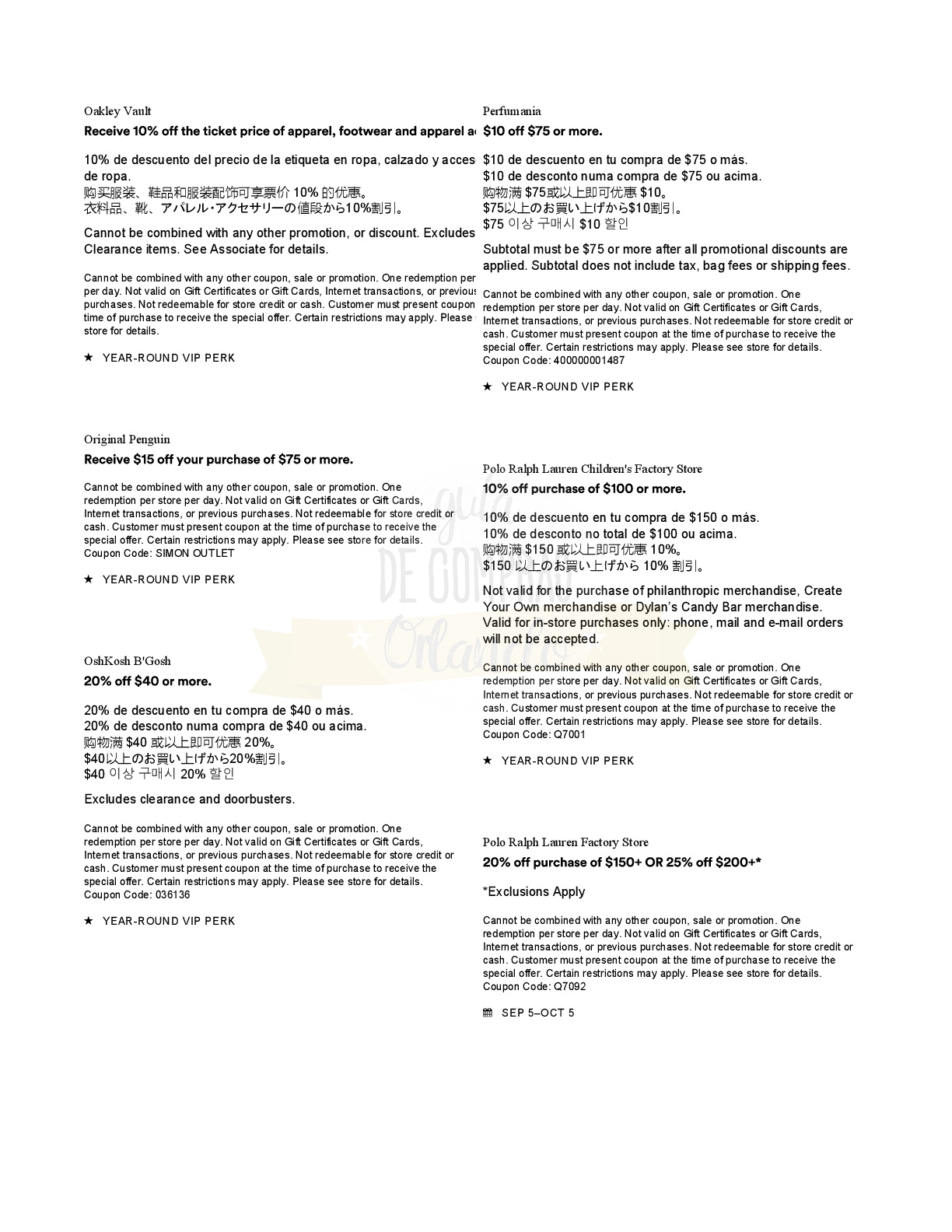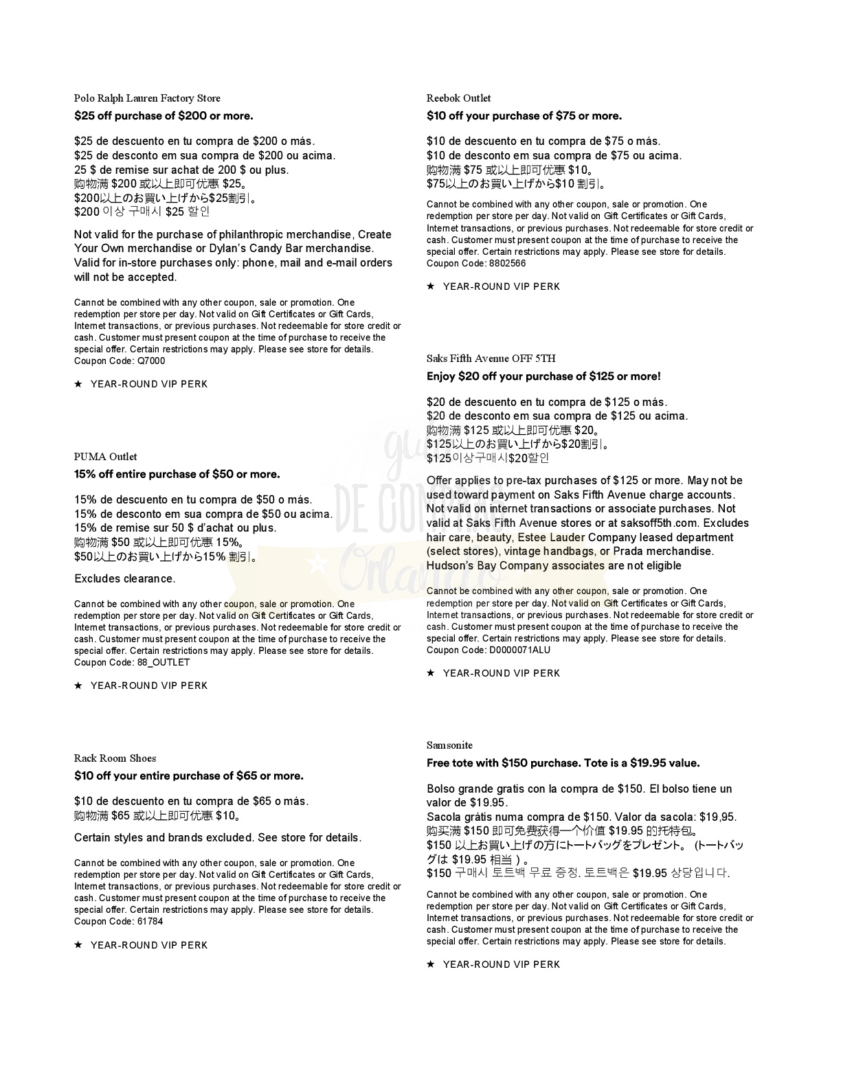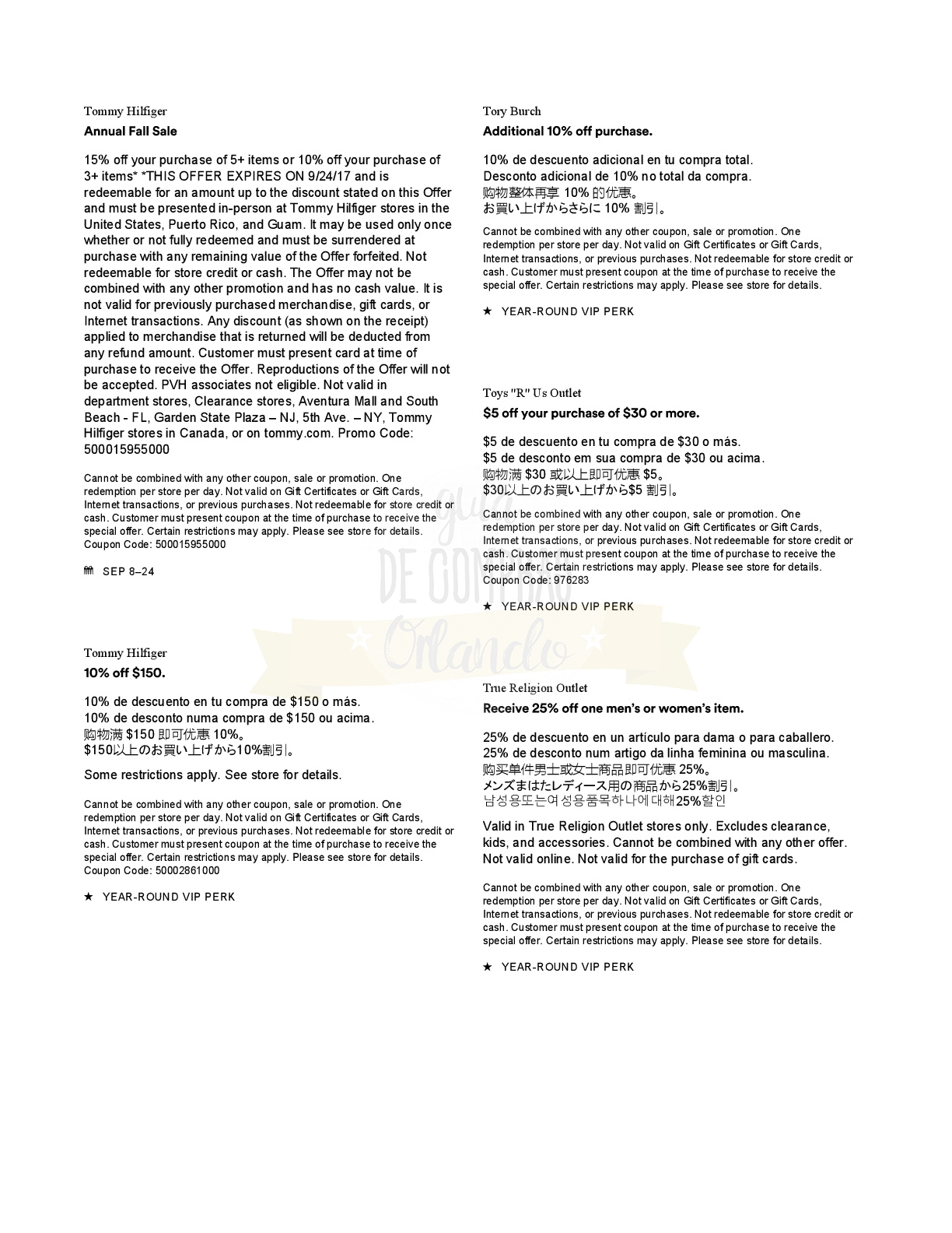 A continuación les dejamos los cupones para las distintas tiendas de Orlando International Premium Outlets ® y un link para conseguir además una cuponera llena de descuentos distintos a los que acá les damos.