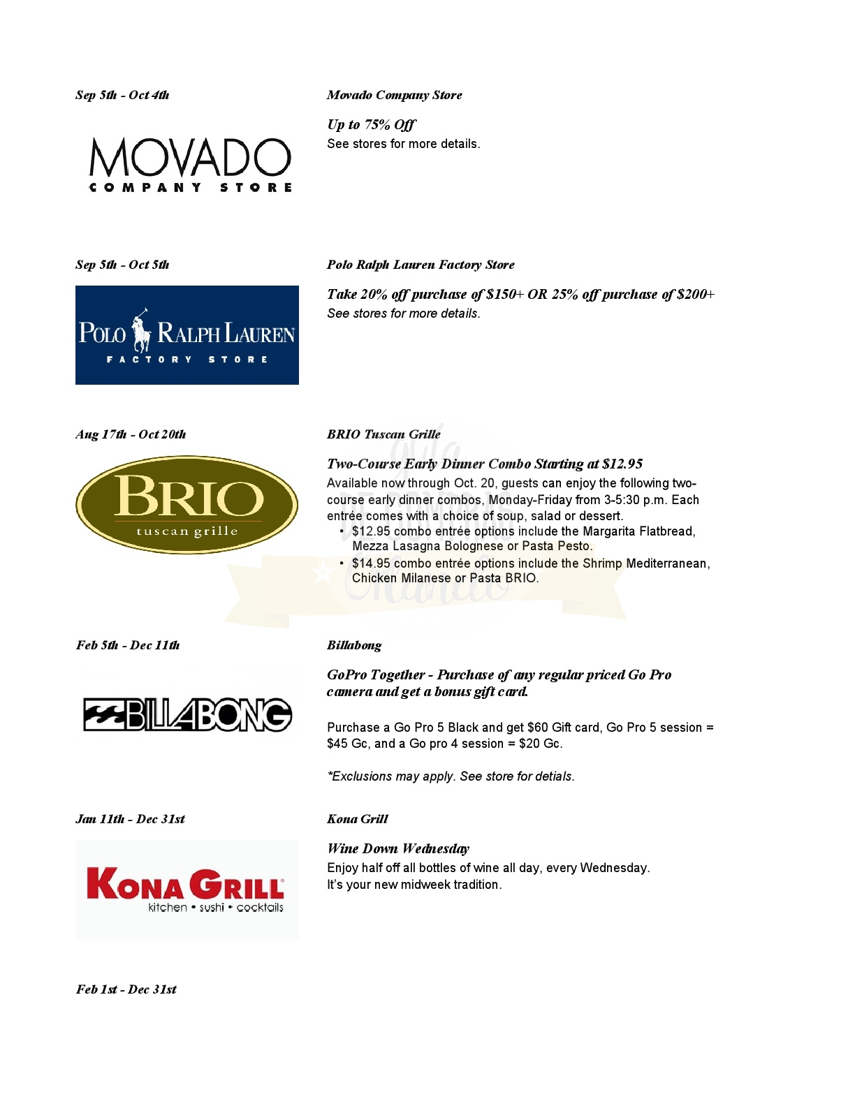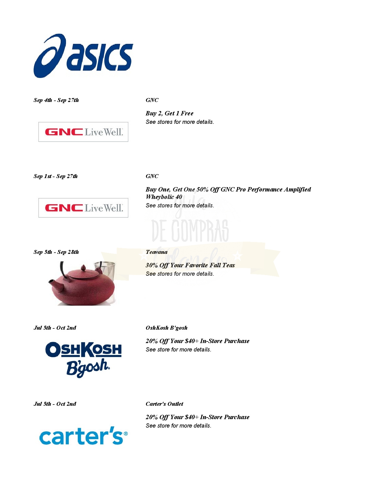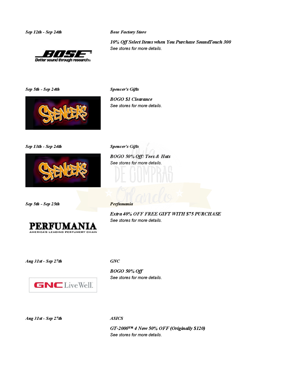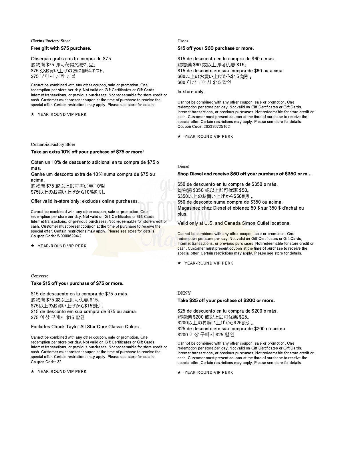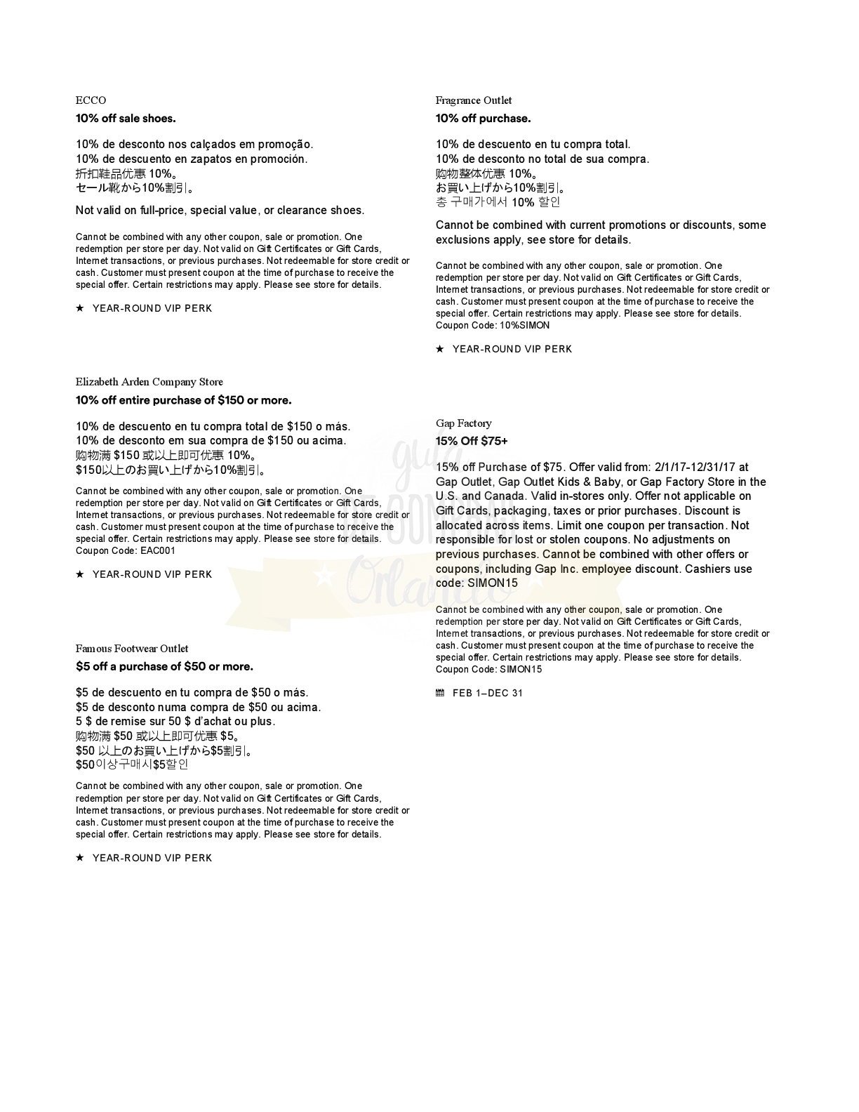 A continuación les dejamos los cupones para las distintas tiendas de Orlando International Premium Outlets ® y un link para conseguir además una cuponera llena de descuentos distintos a los que acá les damos.