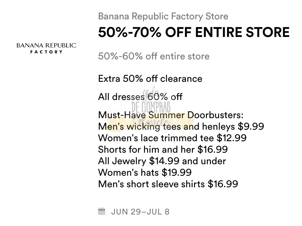 Es el mejor momento para abastecerse de los básicos del verano (Trajes de baño, vestidos, sandalias, shorts, bermudas, camisetas, etc.) ya que las tiendas comienzan a limpiar el inventario para las próximas promociones de “Back to School” – Vuelta al Cole – (la primera semana de Agosto).