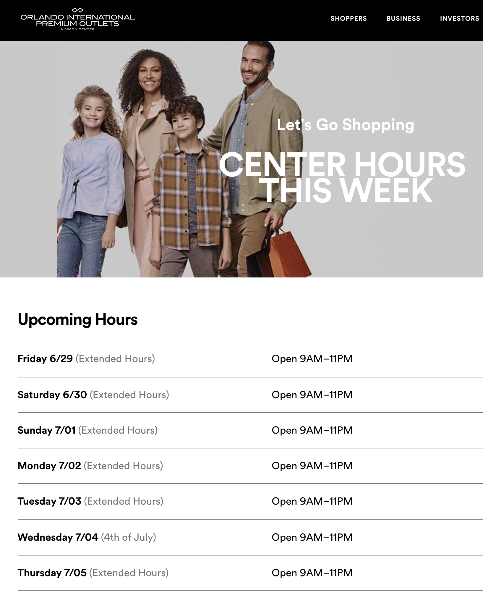 Los horarios han sido confirmados por los Orlando Premium Outlets® tanto para el de International Dr como el de Vineland Av.